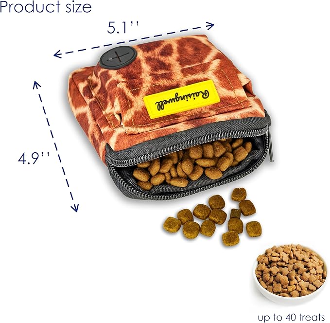 - 1、Fashion Design: This dog training treat bag measures 4.9 x 5.1 inches and offers versatile wearing options. It comes equipped with a carabiner and a strap, allowing you to hang it on your leash, attach it to your pet's collar, or even wear it as a trendy accessory on your bag. The bag features a zipper closure, ensuring that treats stay secure inside even when you're playing with your pet afterward. It's perfect for carrying around or using during short outings.reat Pouch