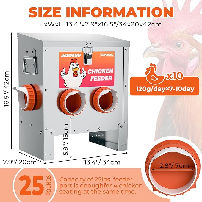 - LARGE CAPACITY: Automatic poultry feeder can hold 25 pounds of feed, chicken feeder is enough for 4 adult chickens to eat at the same time for about 20 days. Save your feeding time. No burden when traveling far away.