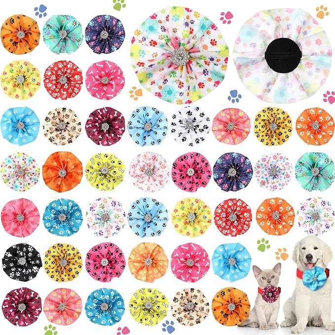 50 Pcs Paw Print Collar Bows Bulk for Dogs Bow Ties Flowers Charms Attachment for Small Medium Large Dogs Cats Collar Accessories Holiday Party Costumes