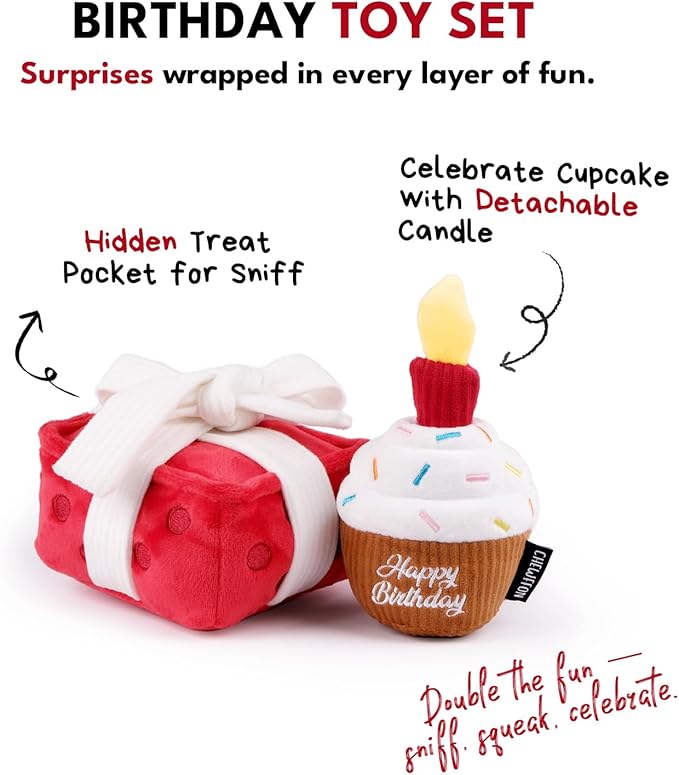 CHEWFFON Dog Birthday Toy, Interactive Snuffle Treat Dispensing Puzzle Toy with Gift Box Design, Squeaky & Crinkle Plush Dog Toys, Suitable for All Breeds