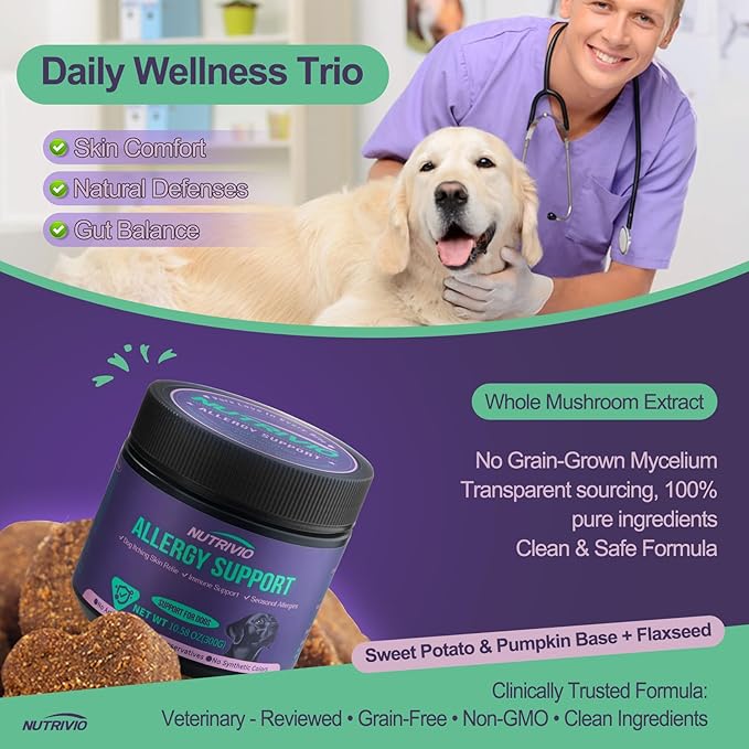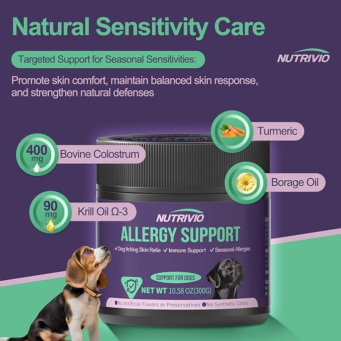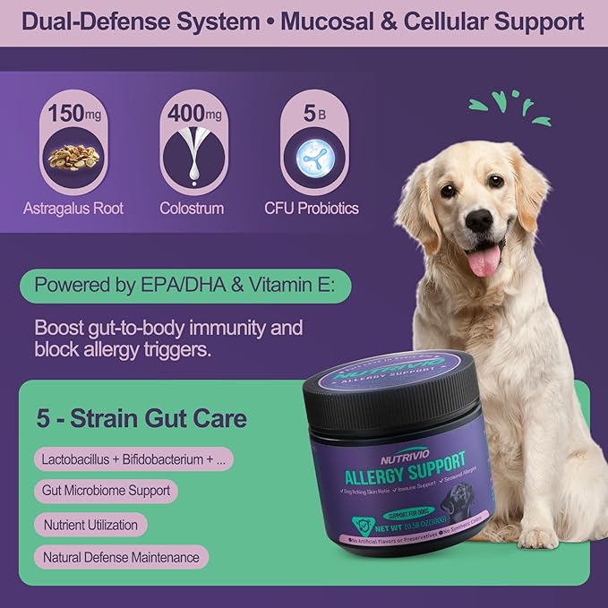 - Dual Support for Immune System & Gut Health – Enriched with powerful ingredients to boost overall wellness: Colostrum and curcumin enhances immunity and strengthens resistance to allergens,helping your dog better fight off allergen-related discomfort; 5-strain probiotics blend maintain healthy gut flora, and improve your dog’s mood during allergy flare-ups.