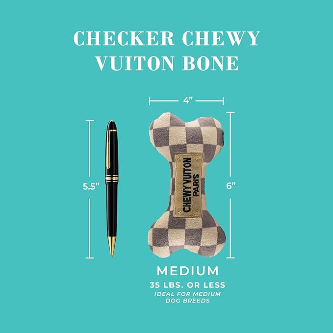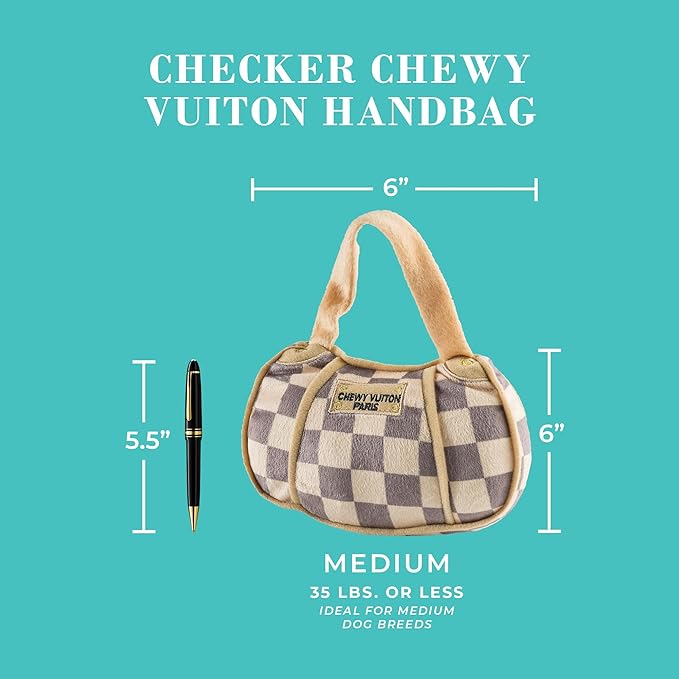 - Funny Parody Plush Dog Toy: Watch your pup strut their stuff with this 3-pack plush dog toy bundle featuring the Medium Checker Chewy Vuitton Handbag, Bone, and Ball. Each soft, squeaky dog toy features a chic taupe and cream checker pattern with a hidden squeaker inside. Perfect for fetch or just to show off in the park, it's a must-have in your dog accessories collection
