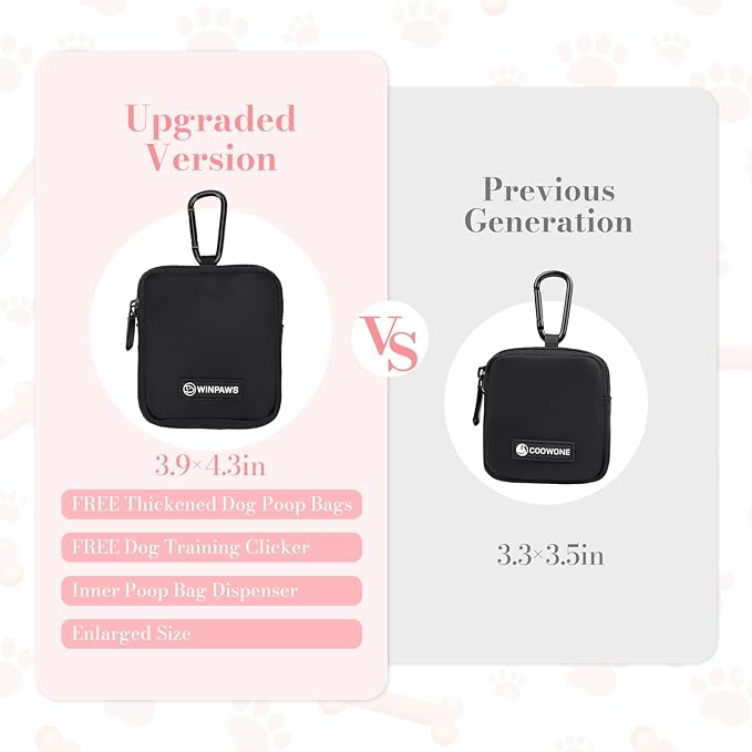- 【Upgraded Dog Treat Pouch】The minimalist dog treat pouch gets a brand-new upgraded size! Measuring 3.9*4.3 inches—can hold about 1.7 cups of dry or wet dog treats. designed specifically for dog training and walks, it’s more practical than the previous small dog treat bag! This upgraded version features a dedicated inner compartment for dog poop bags, allowing to store dog treats and a waste roll simultaneously. Plus, it has a built-in dispenser opening for easy access to waste bags!