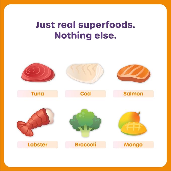 - REAL SEAFOOD & WHOLESOME INGREDIENTS Made with wild-caught tuna, cod, salmon, and lobster for a savory, high-protein base. Includes natural mango, broccoli, and tapioca starch—no by-products, artificial additives, or flavor enhancers. Only clean, digestible ingredients pets (and pet parents) love.