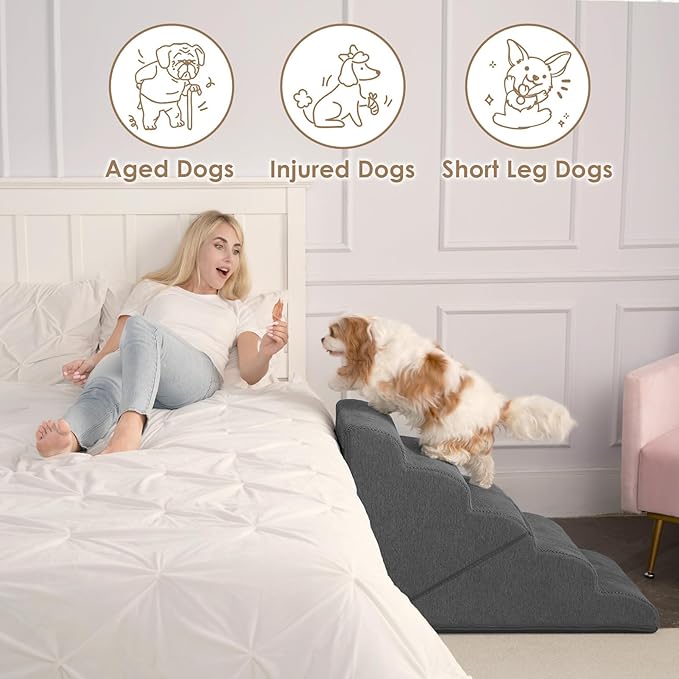 - COMFORTABLE PET STAIRS - This foam dog stair is designed directly against the edge of a bed, sofa or other furniture, so your pet can climb up and down comfortably.