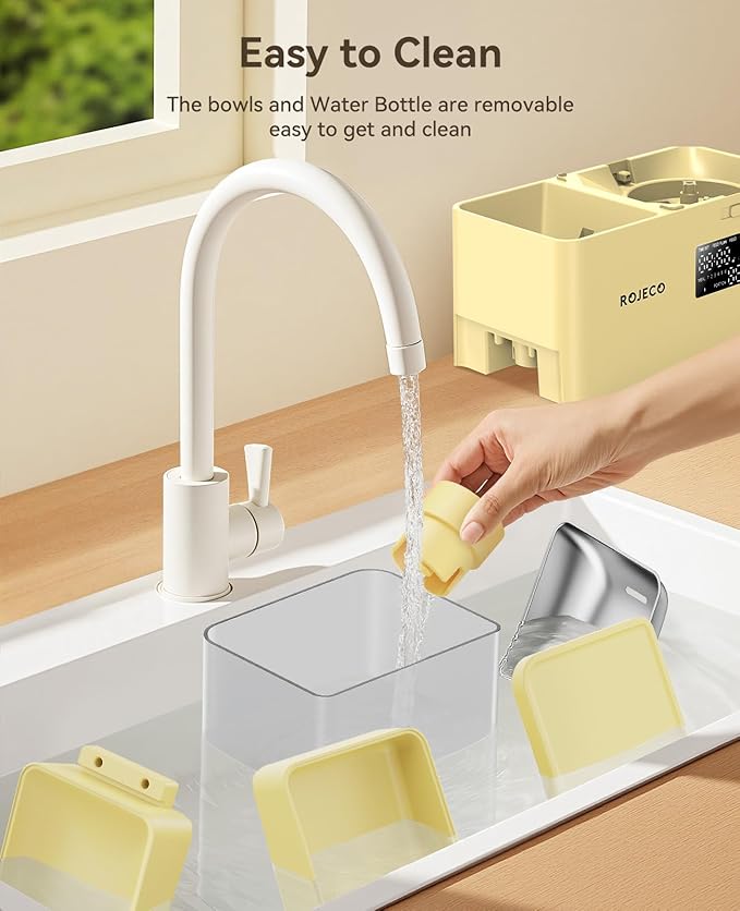 Rojeco 36Cups/8.5L Pet Automatic Cat Feeder and Gravity Water Dispenser,Stainless Steel Bowls 2-in-1 Set Large Capacity 5L Food Feeder and 3.5L Water Fountain for Cats,Pets,Small Dogs,Yellow