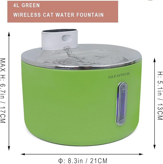 Wireless Cat Water Fountain Stainless Steel, 135oz/4L Cat Fountain, Battery Operated, Cordless Pet Water Fountain for Cats & Dogs with Motion Sensor, Ultra Quiet Pump, 12 Filters (Green, 4L)