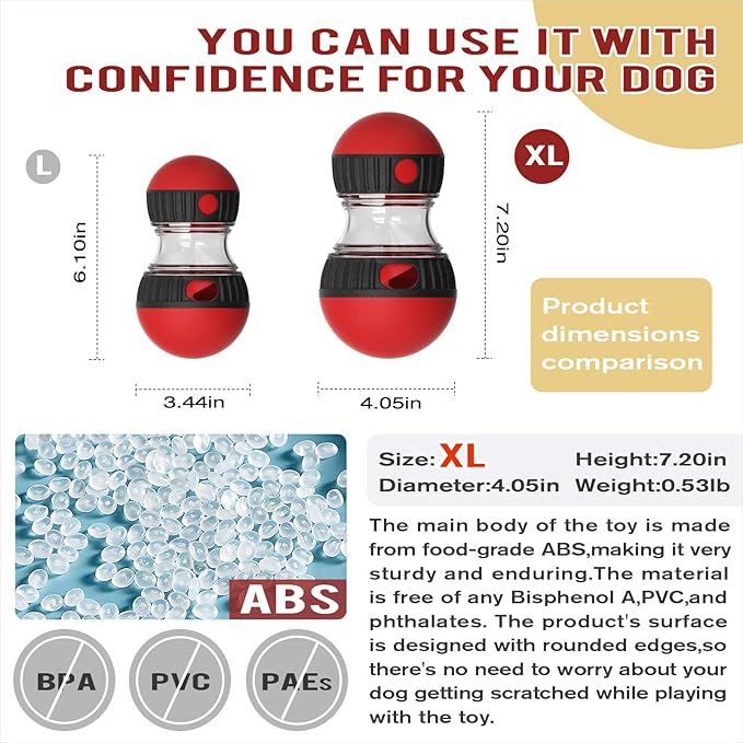 - Crafted from food-grade ABS materials that are free from harmful substances such as bisphenol A, PVC, and phthalates, this toy ensures the safety and well-being of your dog. Its sturdy construction makes it resistant to damage caused by pets, giving you peace of mind while your furry friend enjoys hours of entertainment.