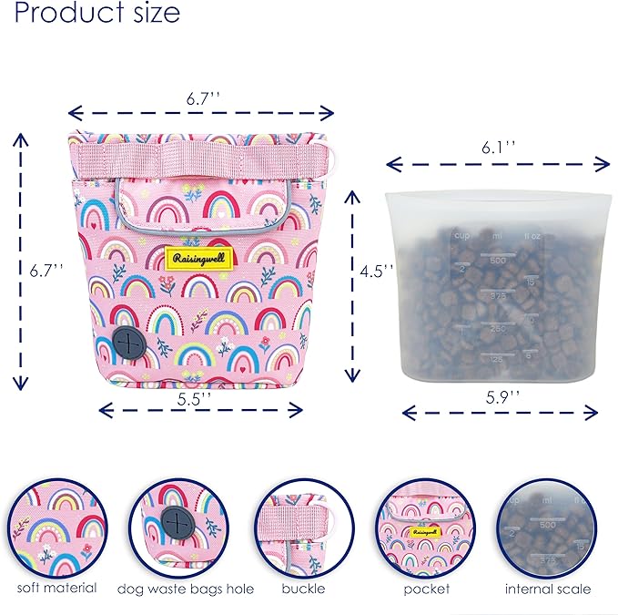 - 5.Durable Tech Material: Raisingwell's dog treat training pouch is made from durable, washable, and non-toxic fabric. Notably, its waterproof lining solves the problem of difficult-to-clean interiors of training bags, making it a great choice for your dog treat bag or dog treat fanny pack.