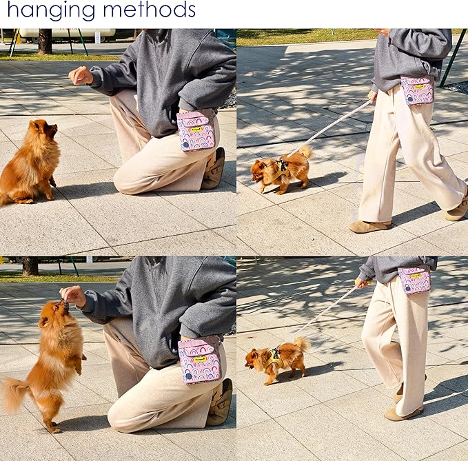 - 3.Enhanced Magnetic Closure: The bag features two sets of powerful magnets at the opening, ensuring automatic closure and preventing food from spilling, even when bending over. A convenient pull tab allows for one-handed opening when you need access to the contents of your dog treat pouch. The strong magnets make it a perfect solution for training and walking, ensuring your treats stay secure in the dog treats holder for training.