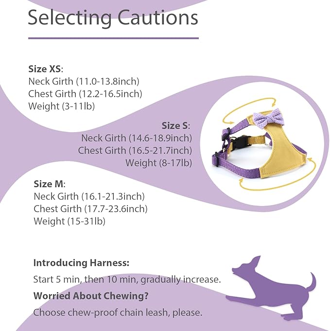 Small Dog Harness with Leash and Bow Tie, Cute Breathable Puppy Harness Easy for Walking, No Pull No Choke Escape Proof Pet Harness, Yellow & Purple XS