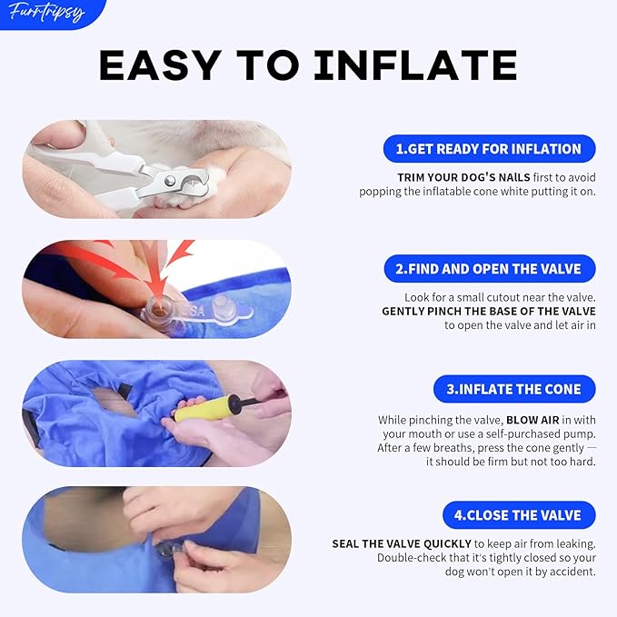 - 【Convenient Inflation】Inflation is a breeze with mouth or a self pruchased air pump.It is recommended to inflate the dog cone to about 80-95% to avoid putting excessive pressure on the seams and potential leakage.Press the valve port after inflation to keep air in.