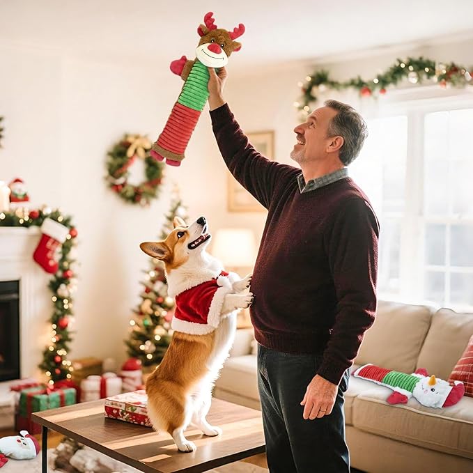 - Great Value and Christmas Plush Set: This assortment value bundle plush pet toy contains 3 pack: Elk, Santa Claus, Snowman. The funny and enrichment toys help dogs to exercise more and improve their health. A good dog products for boredom and stimulating. They can do chewing and teething, tug of war games. Quality interactive playing time together will also increase their bond with owner. It's the best gift supplies for dogs Birthday Christmas Halloween or any holiday.