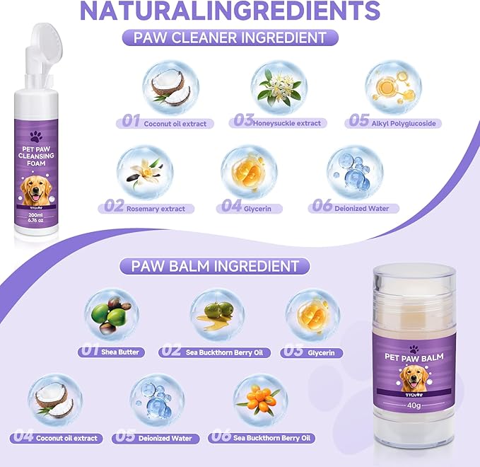 - Safe & Nourishing for All Dogs and Cats – Formulated with gentle, plant-based ingredients including coconut, pomegranate juice, broccoli seed oil, and grape seed oil, our Puppy Paw Cleaner nourishes and soothes while cleansing. Free from sulfates, parabens, drying alcohols, artificial fragrances, dyes, or harsh chemicals. Suitable for small, medium, and large breeds, as well as kittens and cats. Includes Dog Paw Balm to moisturize and restore dry or cracked paws & a soft towel for drying, making it a complete 3-in-1 paw care kit.