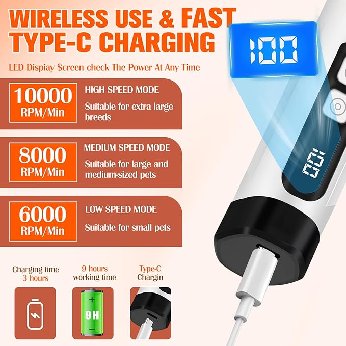 - 🔋【9-Hour Marathon Power dog nail trimmer + Universal Type-C!】 No need to deplete the battery during use! A fully charged dog nail clipper can trim 15+dogs. Power % display kills worry. A dog nail clipper designed with a large battery life, allowing you to trim your beloved pet's nails anywhere!