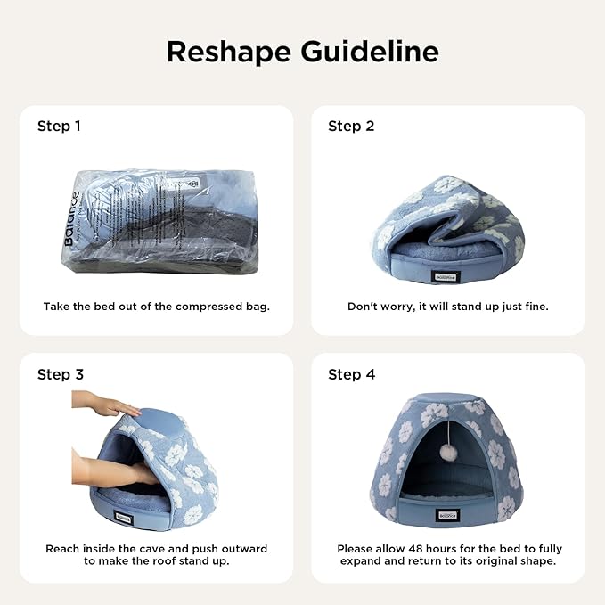 - Care Tips: The inner cat mat is machine washable. The outer cat cave can be wahsed by hand. For best results, allow the kitten bed to fully expand and regain its shape within 48 hours after unpacking