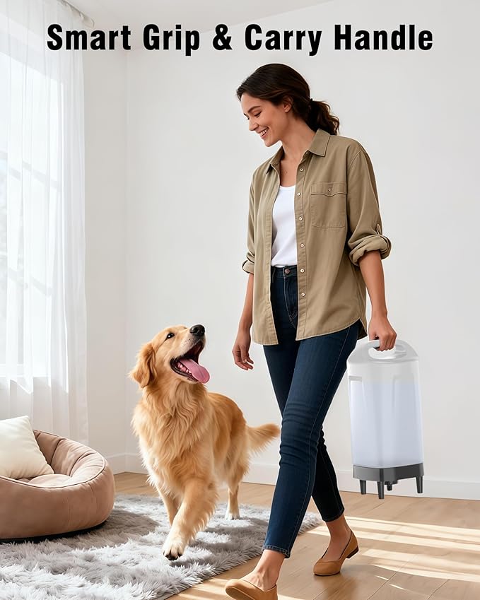 - 【Ergonomic Handle for Easy Carrying】Equipped with a strong built-in handle, the dispenser is simple to lift, refill, and reposition even when full. The practical design minimizes the risk of spills and strain, making it convenient for families, seniors, and households managing large-capacity pet supplies