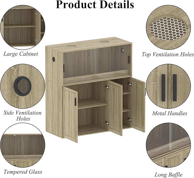 - Ample Storage Space: This reptile cabinet measures 19.7"D x 47.2"W x 51.2"H and measuring 75 gallons, this cabinet is designed with plenty of storage space. The larger compartment in the lower left can accommodate various reptile supplies, while the right side serves as an ideal place for storing reptile feed