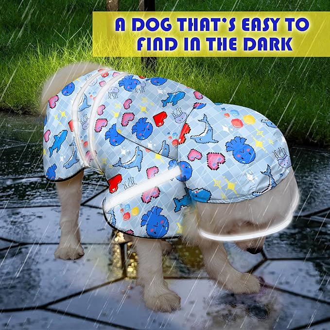 Dog Raincoat, Adjustable Rain Jacket with Hooded Double Layer for Large Medium Small Dogs Puppies, Lightweight Waterproof Rain Coat Poncho with Reflective Stripe Ocean Dolphin Blue,L