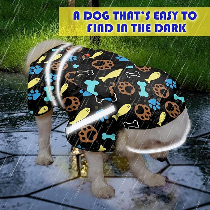 Dog Raincoat, Adjustable Rain Jacket with Hooded Double Layer for Large Medium Small Dogs Puppies, Lightweight Waterproof Rain Coat Poncho with Reflective Stripe Paw Print Black,XXL