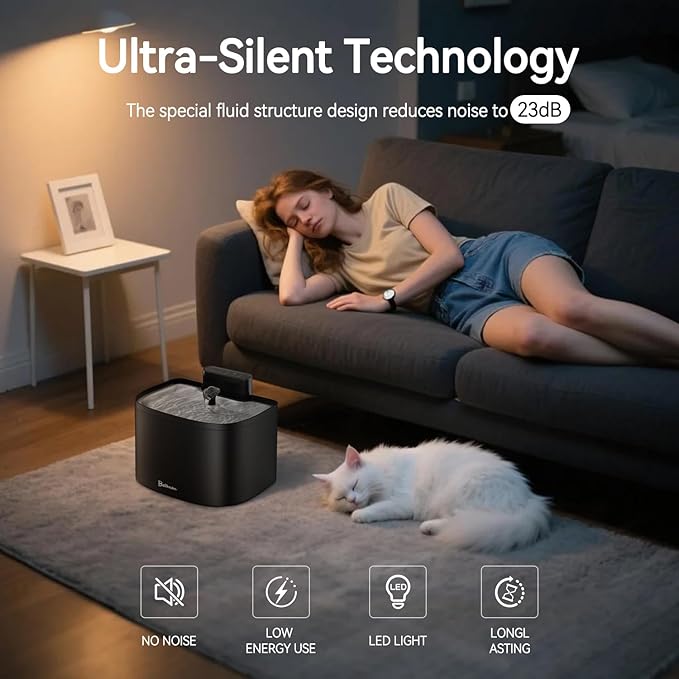 - 【Purrfect Hydration for Your Cat】The Bellkaspet Smart Water Fountain keeps your feline friend happy and healthy with a 304 food-grade stainless steel tray and BPA-free materials, reducing the risk of cat acne. Designed for peace and comfort, it operates at a whisper-quiet 23dB, ensuring undisturbed sleep for both you and your pet.Smart & Safe Features:Auto-shutoff pump when water runs low to prevent dry operation.130mL emergency water reserve keeps your cat hydrated during short power outages.Give your cat the freshness they deserve—safely and silently!