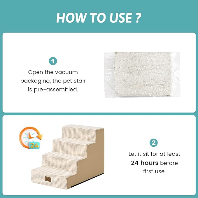 - Easy to Use: Dog stairs are vacuum-compressed and packed together after assembly, so after taking it out of the vacuum-sealed package, please let the sponge sit for 48 hours to fully expand before use. Slight wrinkles on the cover sides may appear after unpacking but can be smoothed out by washing or ironing