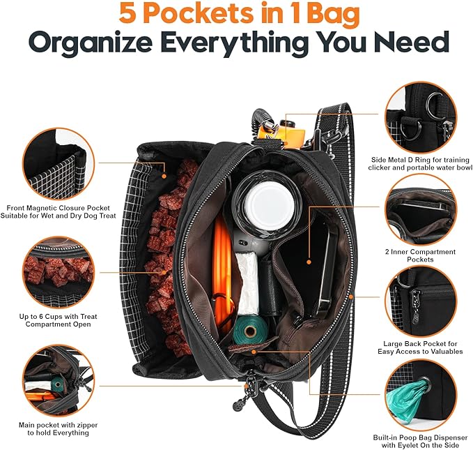 - Spacious Multi-Pocket Design with Built-In Poop Bag Dispenser: Large main pocket with two inner dividers and dedicated poop bag compartment keeps treats, tools, and essentials organized and easy to reach
