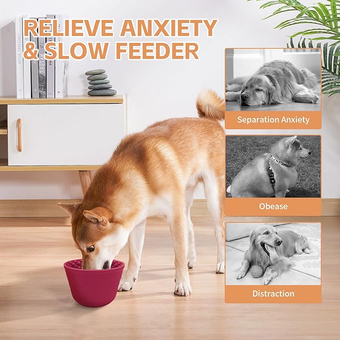 Dog Lick Bowl with Brush and Scraper, Anxiety Relief Silicone Slow Feeder Treat Dispenser, Anti-chocking Pet Dish, Non-Slip Interactive Entertainment Dog Puzzle Toy for Medium & Large-Dark Red