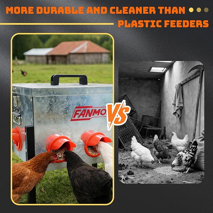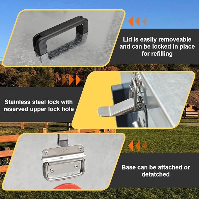 - 2. Intelligent No-Waste Design Features a locking lid for a rat proof chicken feeder solution. Gravity-fed ports create a no waste chicken feeder system, minimizing spillage. Essential for urban poultry keepers preventing rodent attraction in coops.