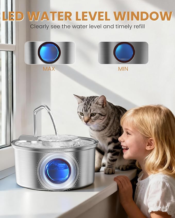 - 【Stainless Steel Easy To Clean+ Water Level Window】Crafted from premium 304 stainless steel, BPA-free, and easy to clean—eliminating black chin concerns. Paired with an transparent water level window, water volume is instantly visible, allowing you to monitor refill timing effortlessly for more relaxed pet care.