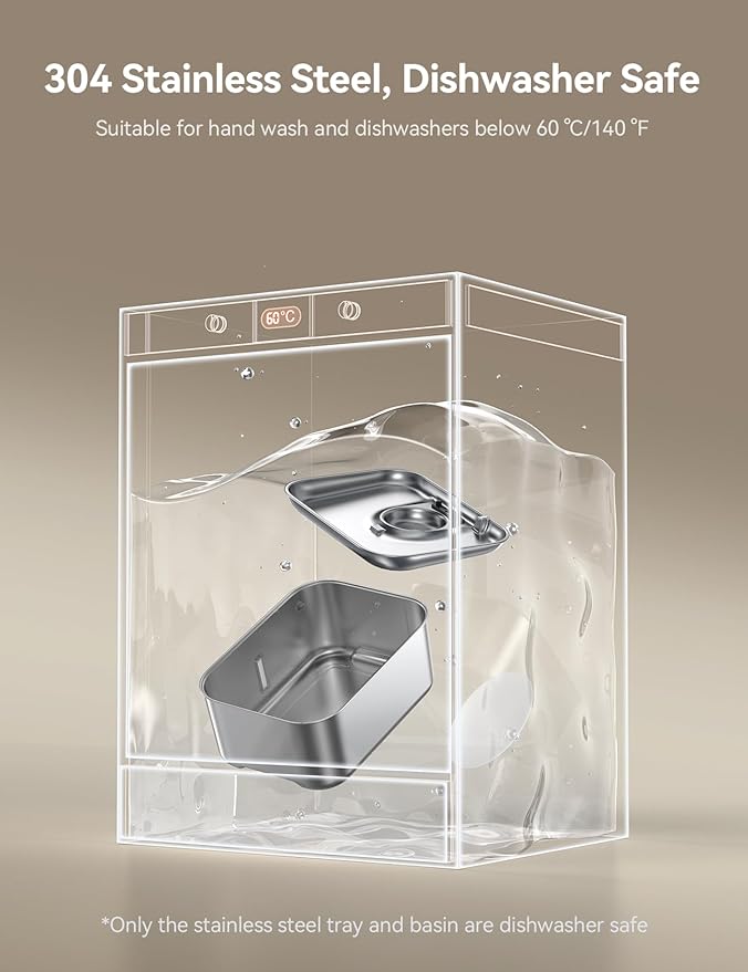 - 304 Stainless Steel Material: Crafted from 304 stainless steel, the water tank and tray are safer and more durable than plastic. This material ensures clean, healthy pet water and helps prevent feline acne. Plus, it's suitable for dishwashers below 60 ℃/140 ℉