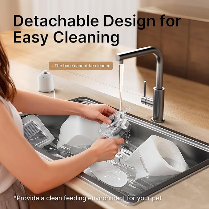 - Easy to Clean: All food-contact components, including the food tank and food bowl are detachable and washable,(Do not wash the base), making it easy to keep your feeder fresh and hygienic. Spend less time cleaning and more time with your pet.