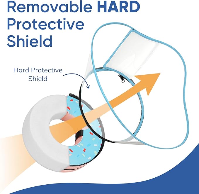 - Extra Protective Shield - The dog neck donut pillow after surgery features a detachable hard shield that adds firm protection to prevent licking, biting, or scratching sensitive areas. This upgraded structure is especially useful for active or stronger dogs who typically break or bend soft dog head cones. Simply attach or remove the shield based on your dog’s recovery needs.