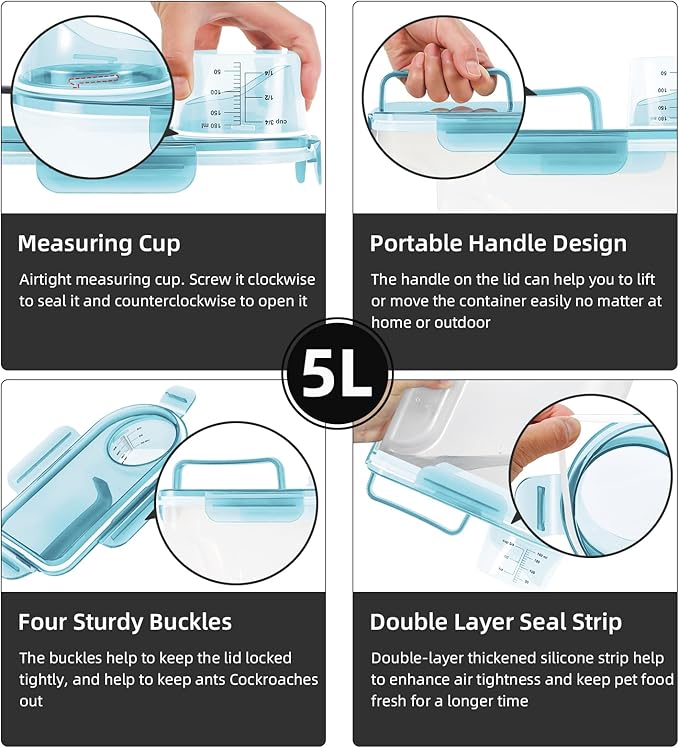 - MULTI-PUrRPOSE STORAGE:Our pet food container is suitable for storing dog food、cat food、bird seed、fish food、rice、 dry food、cereals、oats、cat litter 、flour and other large and small grains, as well as washing powder used at home. It is also a good choice.