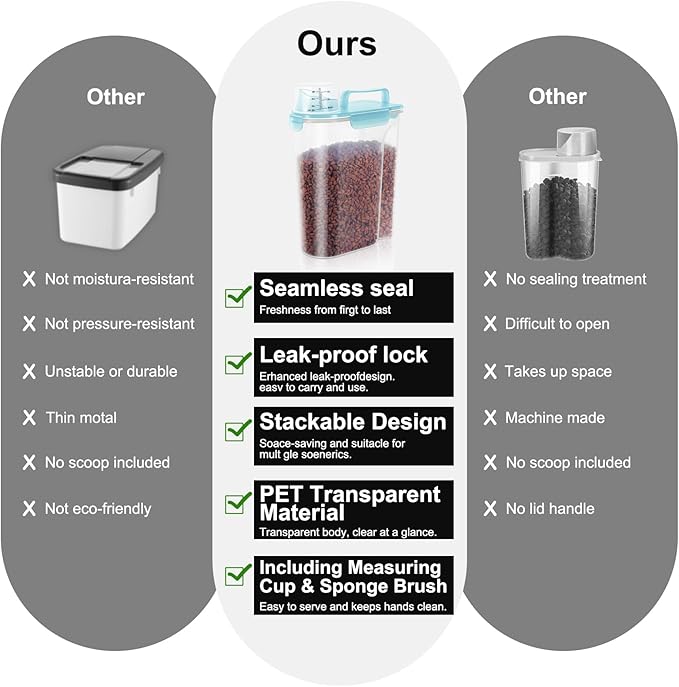 - FRESH SEALED CONTAINER:The dog food container is double-sealed with press-type snaps and silicone sealing gasket. The slot design keeps the food from moisture. There are four snaps on the side of the sealing cover, which provides excellent sealing and ensures Food freshness and freedom from moisture, dust and pests.