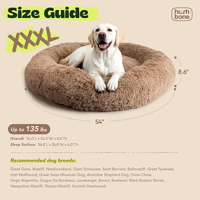 - Size Guide:Available in 4 Sizes:Large (36"x36" x8") pet bed weighing 50 lbs.X large (42"x42" x8") pet bed weighing 80 lbs; XX large (48"x48" x8.6") pet bed weighing 125 lbs;XXX large (54"x54" x8.6") pet bed weighing 135 lbs.This round bed with faux fur is very soft,warm and comfortable for your lovely friend.The circular design is more in line with the sleeping nature of pets.