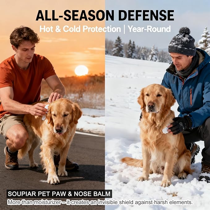 - 100% LICK-SAFE & VET-TRUSTED FOR DOGS & CATS - Soupiar’s paw and nose balm targets dry, rough paws and chapped snouts—pet parents’ top concern solved. Soothes discomfort from hot pavement, hiking trails, cold winds, or allergens with a gentle touch. Safe for daily use on all dry spots of your furry family members, no irritation even for sensitive skin.