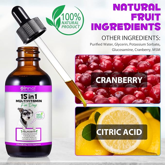 Dog Multivitamin, 15 in 1 Dog Multivitamin Liquid Drops Supplements, Dog Vitamins for Support Skin & Coat, Heart Health, Bones, Joint, Immune System Support, 60ml
