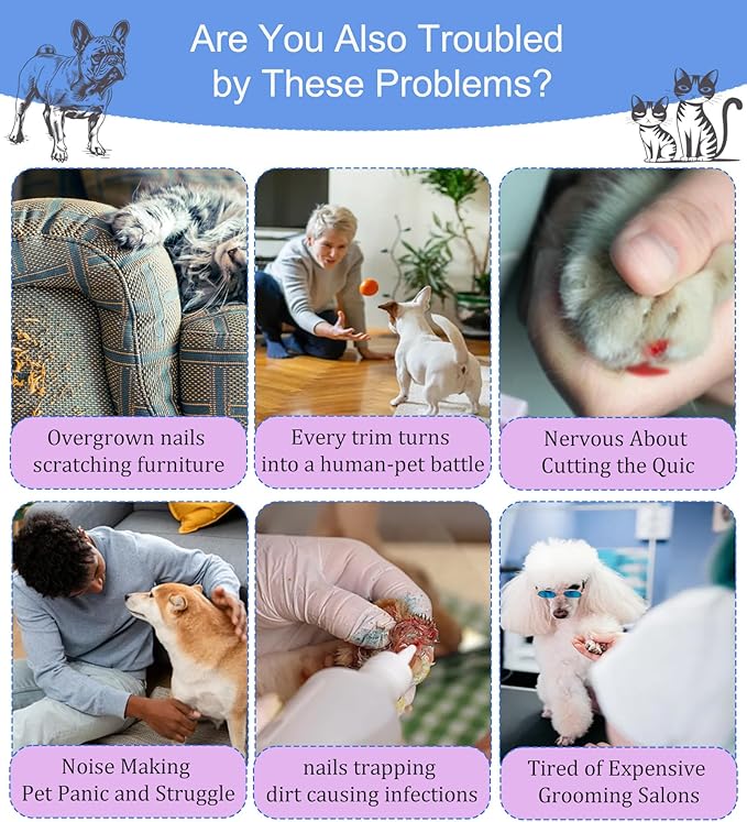 - 🎄🐾【Safe & Painless, No More "Quick" Anxiety】Traditional clippers risk cutting the quick and hurting your pet. Our solution: a detachable guard with built-in LED light that clearly reveals the nail's interior, so you can grind with confidence. It gently sands nails down bit by bit—no startling clips, just smooth, stress-free shaping. Perfect for sensitive pets, it delivers painless results and leaves everyone feeling calm and secure