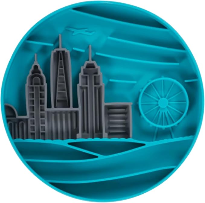Messy Mutts and Cats Interactive Slow Feeder | Urban City Blue - 2 Cup Capacity | 8” Round Silicone Puzzle Slow Feeder for Dogs/Cats | Enrichment Food Dish for Slow Eating, Bloating