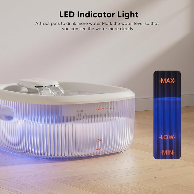 - 【Visual Water Level & Smart Red Light Reminder】WOPET dog water bowl dispenser comes with visible water level window, you can clearly observe the remaining water level without opening the cover. Never Run Dry! Worried about forgetting to refill? Our upgraded anti-dry pump alerts you with a red LED light when water runs low. Plus, the emergency reserve lid provides backup water during power outages—because pets should never go thirsty.