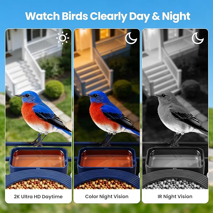 - 【Video Bird Feeder Camera Live】 Bird feeder camera with 2K Ultra HD lens & 120° field of view, observe backyard birds feeding and playing up close, full-color/infrared night vision elevates your birding experience day and night. Bird feeder with camera immersing you in nature birds life, enjoy bird watching anytime, anywhere