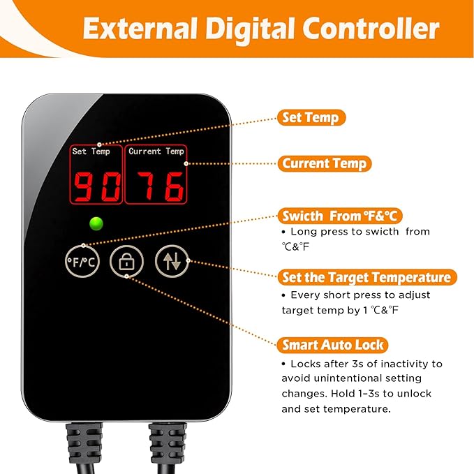 - Easy & Secure Temperature Adjustment: Adjust the water temperature effortlessly using the external controller. Long press the lock button for 1–3 seconds to enter setting mode, then press the temperature button—each press adjusts by 1°F/°C (range: 59°F–94°F / 15°C–34°C). The system automatically locks after 3 seconds of inactivity to prevent accidental changes.