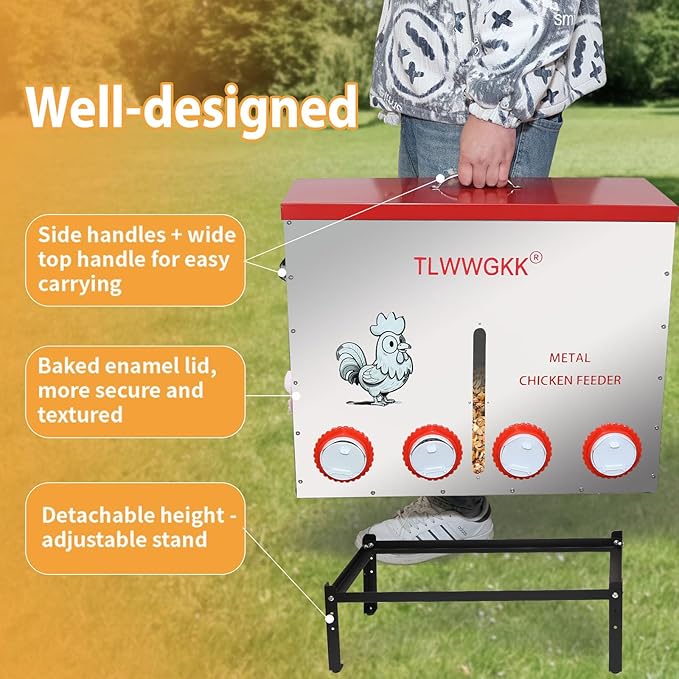 - DURABILITY: Made of galvanized rust-proof metal, this industrial chicken feeder is all-weather resistant, withstands outdoor elements, keeps feed clean, and prevents spillage or spoilage for long-lasting use.