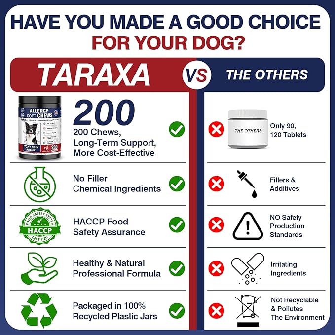 - [Generous Supply and Lasting Results] Each bottle contains 202 dog chews for allergies and itching, providing for consistent dog allergy support for dogs itchy skin relief of all ages, breeds and sizes. Designed for daily use, dog allergy relief chews offer lasting benefits, ensuring continuous from discomfort dog itching and dry skin relief for dogs stop dog licking. Whether for a growing puppy or a senior dogs, aller immune bites for dogs helps maintain long-term skin and coat health