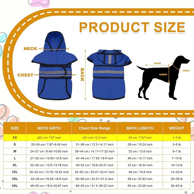 - Highlighted Features: This dog raincoat delivers convenience with quick-adjust hook-and-loop fasteners at the neck and belly for a secure, custom fit. Your pet's safety is enhanced through integrated reflective strips on the hood and body for improved visibility in low light.