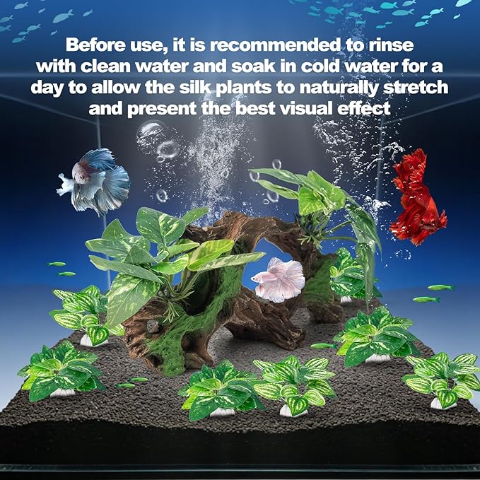 - 8 Pcs Silk aquarium plants set: Containing artificial driftwood - 6.3 x 2.8 x 3.9 inches (L x W x H); 7 Pcs Silk plants - 2.4 inches tall