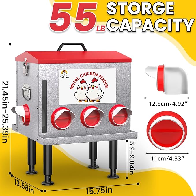 - 【Rust-Proof Alloy Steel Chicken Feeder】Cybrasc poultry feeder is made of heavy-duty alloy steel that resists rust and corrosion for long-lasting durability. Unlike plastic feeders, it won’t rust through, deform, or contaminate feed, keeping food clean and hygienic for your chickens. The smooth surface makes cleaning easy, reducing maintenance time and replacement costs, while the reinforced metal housing resists impact and temperature changes—perfect for outdoor poultry feeding.