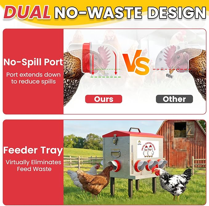 - 【Dual No-Waste System Saves Money】The No Waste Chicken Feeder features a two-part system which nearly eliminates food waste. The downward-deep ports prevent chickens from raking out feed, while an external tray catches every crumb—cutting feed waste by over 99% versus open feeders and significantly reducing long-term feed costs.