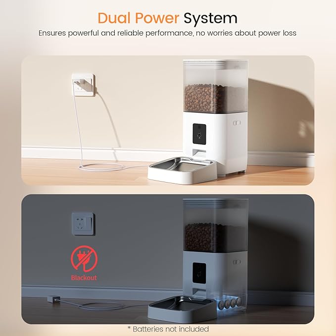 - 【Reliable Power & Easy Maintenance】This automatic cat feeder supports dual power supply — use the included adapter or add backup batteries (4×D batteries required, not included) to maintain scheduled meals during outages. The 6L removable food tank is sealed against moisture, features anti-jam mechanics, and pairs with a detachable SUS304 stainless steel bowl — all easy to clean for lasting hygiene.